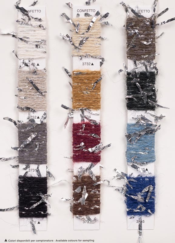 A silver lamé ribbon yarn wraps around an alpaca/mohair base, creating a playful and eye-catching fancy yarn, even in the brightest colors.