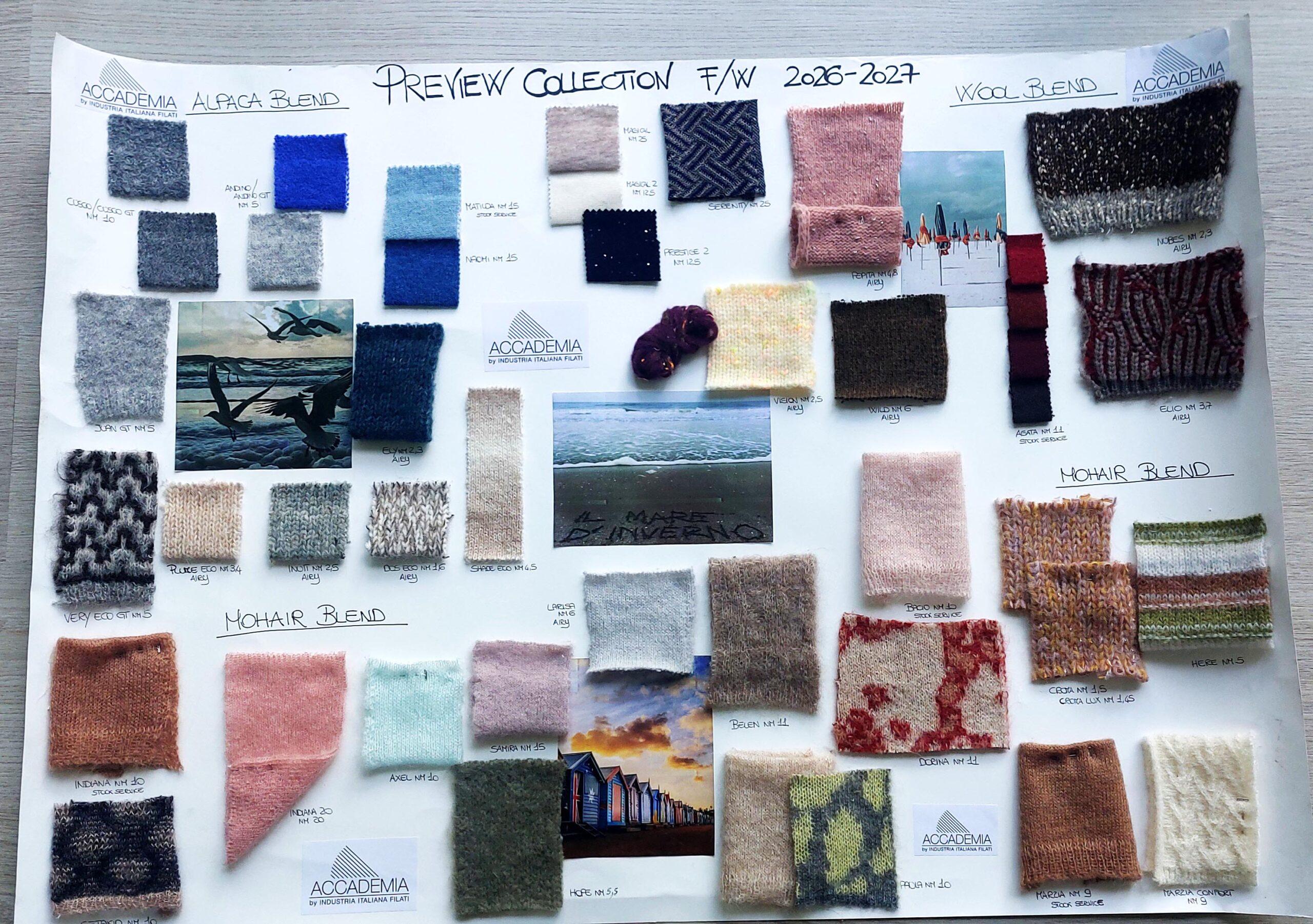 This collection was born from an image: a seaside landscape in the off-season—silent, deep, and atmospheric. The track Forbidden Colors by Ryuichi Sakamoto accompanied this moment of inspiration, suggesting a stylistic direction made of lightness, emotion, and introspection. Our yarns emerged from this vision poetic and airy, yet with a strong and defined character. The color palette follows the same mood: soft neutrals, dusty accents, and vivid tones that break the silence and infuse energy.